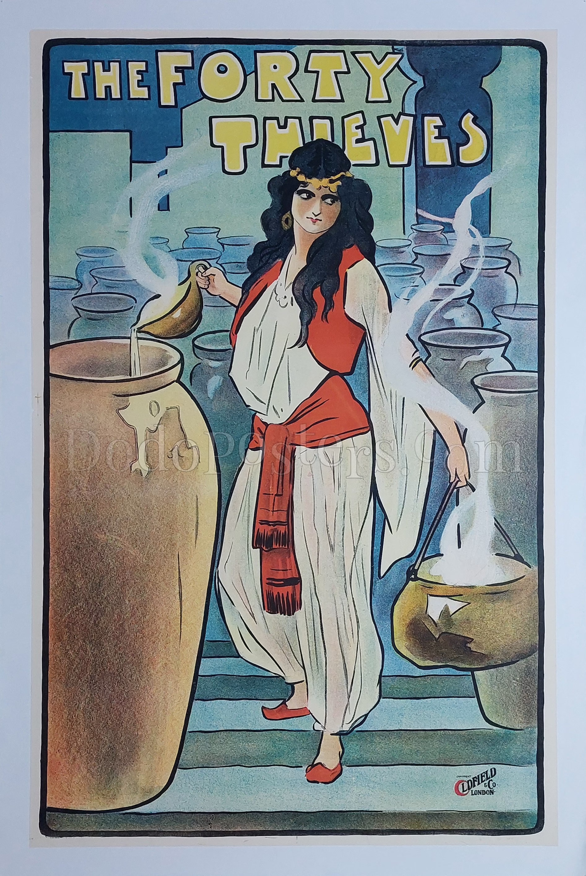 The large version of this poster is an imposing three‑sheet stone‑lithograph announces the festive pantomime The Forty Thieves. A richly robed young woman stands before a rank of giant earthenware jars, up‑ending a golden ewer of boiling oil as steaming vapours billow up.