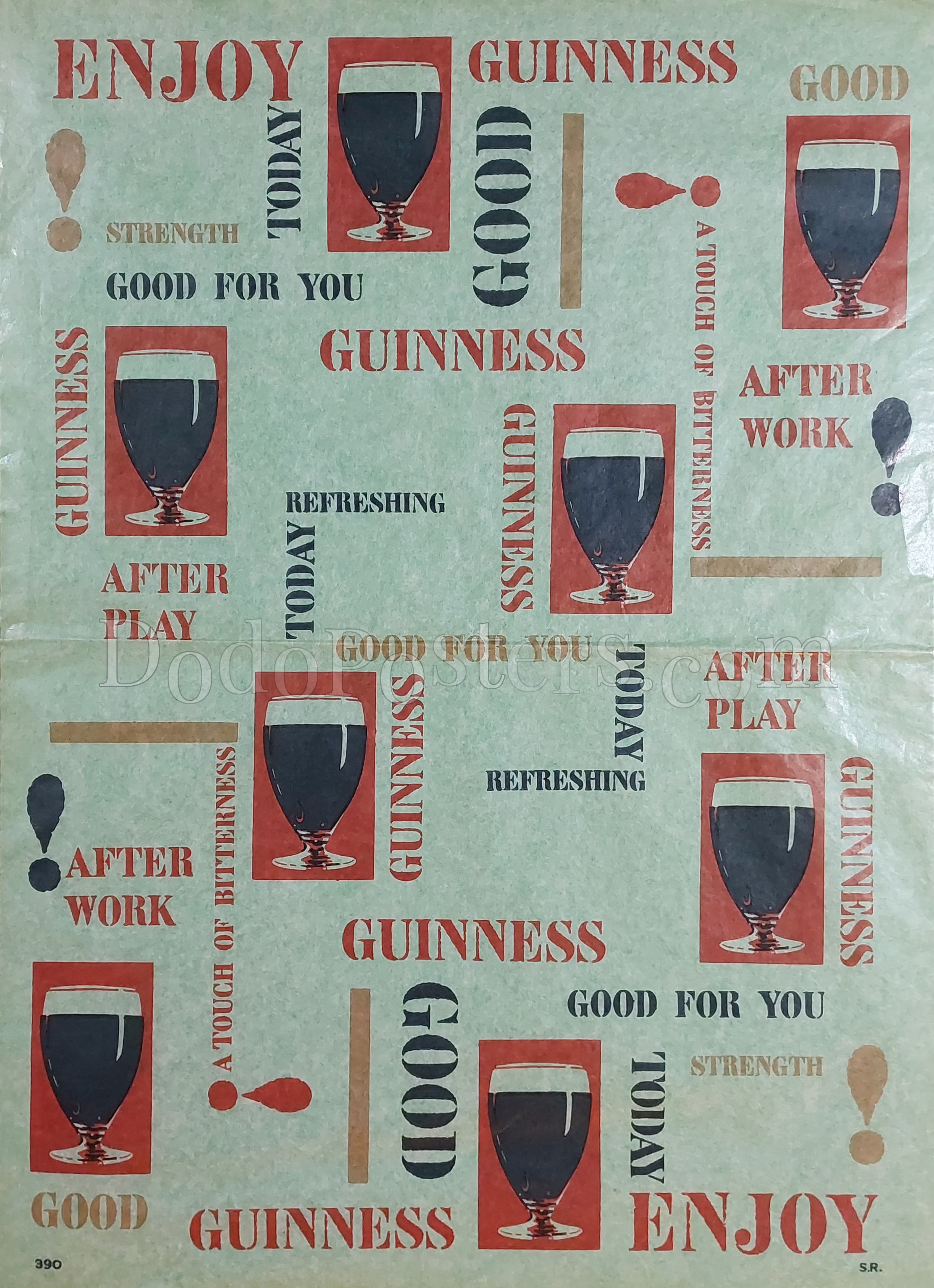 A repeat-pattern Guinness wrapping sheet featuring multiple pint goblets in red panels, surrounded by typographic slogans: “ENJOY”, “TODAY”, “GOOD”, “GOOD FOR YOU”, “STRENGTH”, “REFRESHING”, and “AFTER WORK / AFTER PLAY”, plus exclamation motifs.