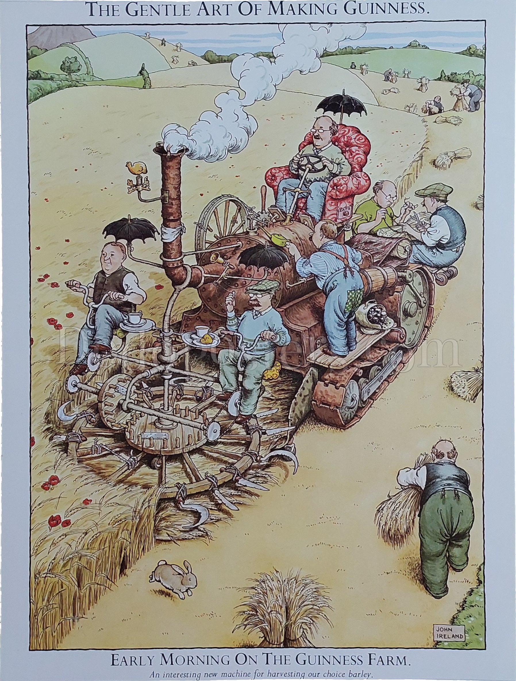 A humorous rural scene shows a fantastical steam-powered harvesting machine trundling through barley, staffed by farmers enjoying tea breaks and creature comforts. The sheet carries the series header “The Gentle Art of Making Guinness” and the caption “Early Morning on the Guinness Farm”, with the line: “An interesting new machine for harvesting our choice barley.”