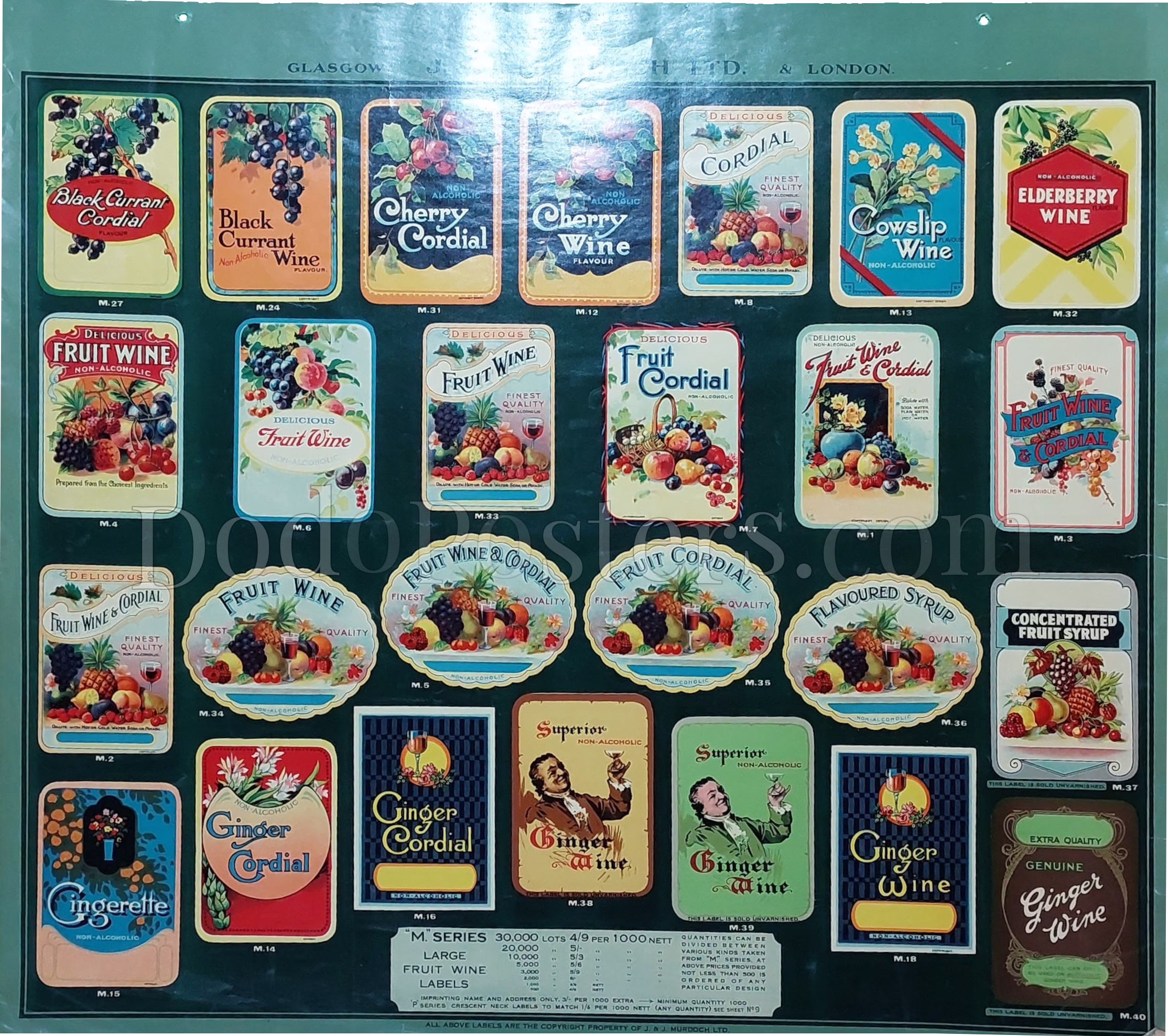 A large Murdoch printer’s sample sheet headed “GLASGOW … J. & J. MURDOCH LTD. & LONDON”, presenting the “M” series of colourful drink labels: Black Currant Cordial, Cherry Cordial/Wine, Cowslip Wine, Elderberry Wine, Fruit Wine & Cordial (multiple shapes), plus Ginger Cordial / Ginger Wine designs, with a trade panel at bottom listing quantities and net prices per 1,000.
