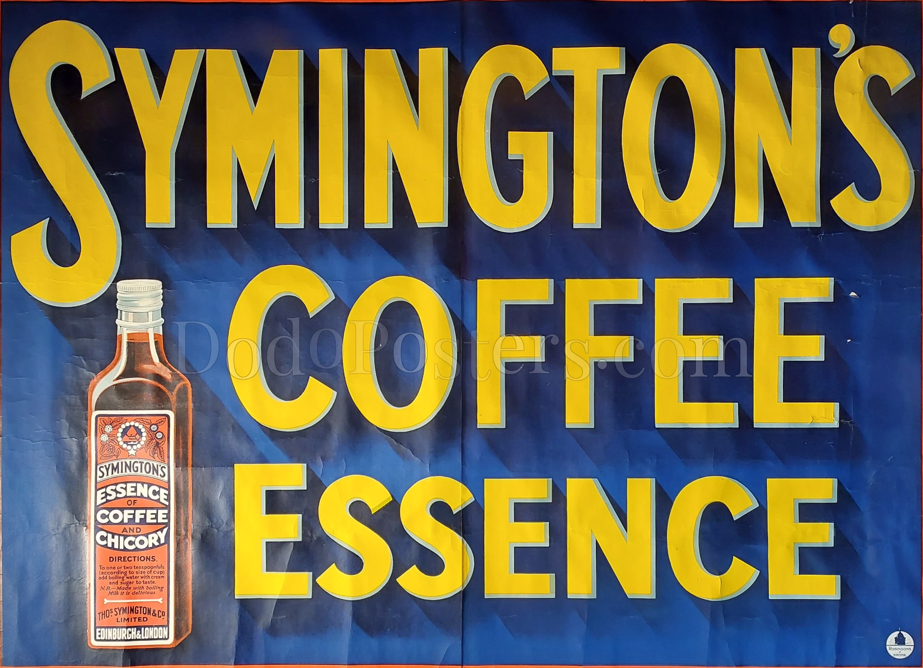 A striking, pared-back design dominated by the headline “SYMINGTON’S COFFEE ESSENCE” in large yellow slab-serifs set against a deep cobalt ground. The product bottle is shown at oversized scale reading “Essence of Coffee & Chicory,” making the poster instantly legible at distance. The uncluttered composition focuses purely on product and brand, a hallmark of 1930s point‑of‑sale pieces.